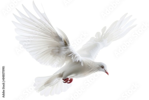 A white bird soars through the air with its wings spread, ready to take off