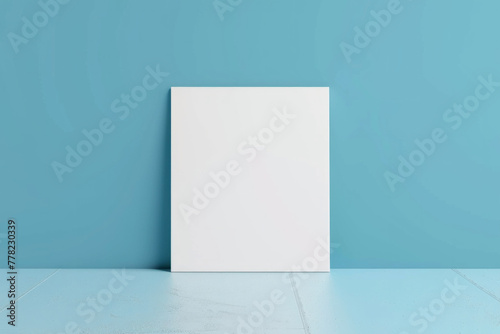 A white blank canvas hanging on a clean blue color wall