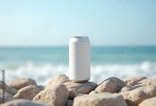 A white blank mockup Soda Can Mockup on Rocky Surface on a beach