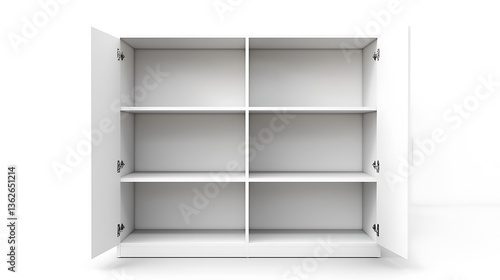 A white bookcase with six shelves and open doors
