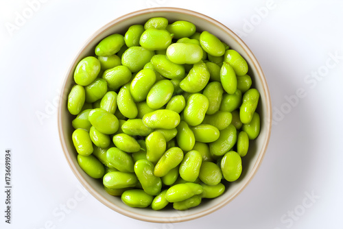 A white bowl filled with bright green shelled edamame beans against a plain white background, highlighting a healthy, protein‑rich vegetarian snack.