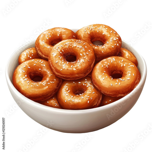 A white bowl filled with numerous golden brown, sesame seed topped donuts.