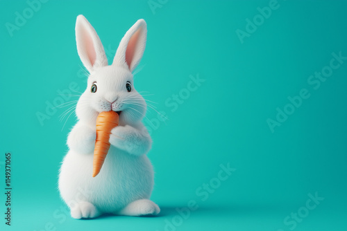 A white bunny rabbit holding a carrot in its front paws, giggling happily