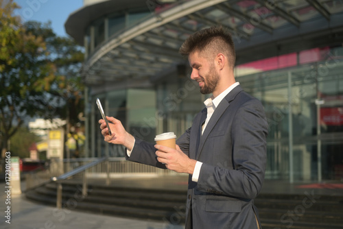 A white businessman in a suit is having a video call on his cell phone while outside an office building