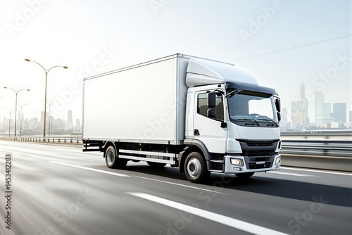 A white cargo truck driving on a highway, realistic style, with a modern city skyline in the background. Concept of transportation and business logistics. Ai generative