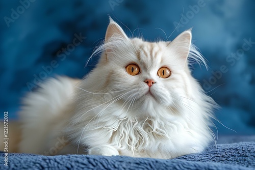 A white cat laying on top of a blue blanket