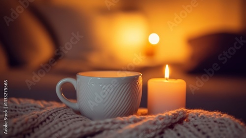 A white ceramic mug and lit candle on cozy knit fabric