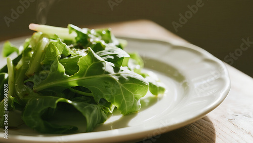 A white ceramic plate with a fresh green salad on a wooden table