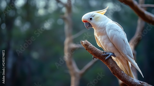 A white cockatoo perched on a branch in a lush, blurred forest setting, showcasing its vibrant feathers