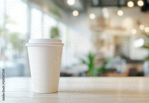 A white coffee cup sits on a wooden table in a cafe