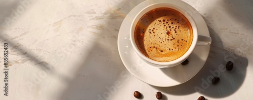 A white coffee cup with coffee and coffee beans on a table. Free copy space for banner.