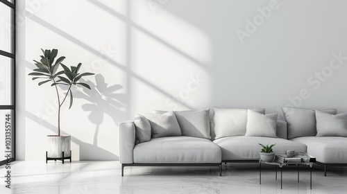 A white couch is in a room with a window and a potted plant. The room is very clean and bright, giving off a feeling of calm and relaxation