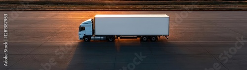 A white delivery truck drives on an empty road at sunset, showcasing a serene and open landscape.