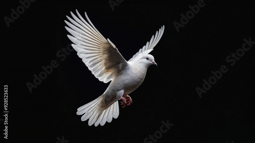 A white dove captured mid-flight against a black background, symbolizing peace and freedom.