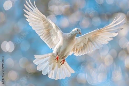 A white dove in flight, wings spread wide against a soft blue bokeh background.