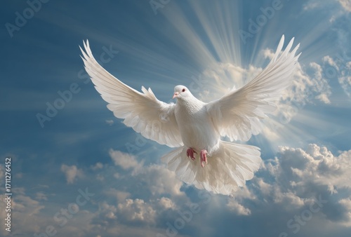 A white dove soars against a sky filled with sun rays piercing through fluffy clouds, creating an effect of light and peaceful movement