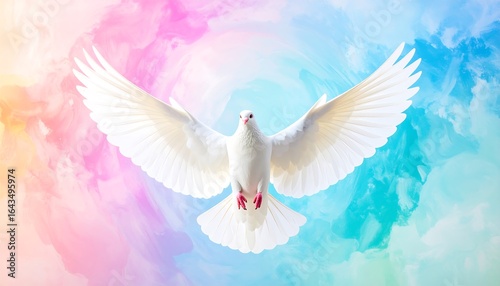 A white dove soars amidst vibrant pastel clouds