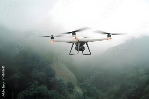 A white drone hovering over a misty green forest, emphasizing the harmony between advanced technology and nature. The scene features soft diffused lighting and a cinematic atmosphere.