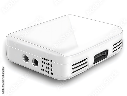 A white electronic device with various ports and ventilation slots