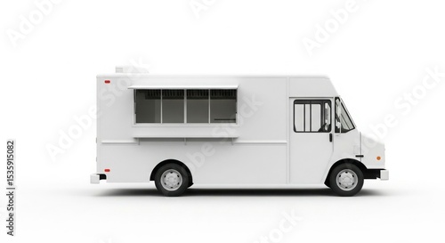 A white food truck, side view, against a plain white background.