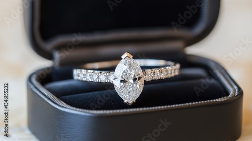 A white gold engagement ring with a pear-shaped diamond resting inside an elegant black jewelry case