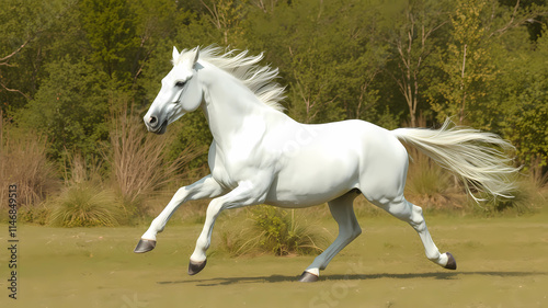 a white horse is galloping through the sand dunes in the desert, with its tail blowing in the wind, Boleslaw Cybis, precisionism, majestic, a computer rendering