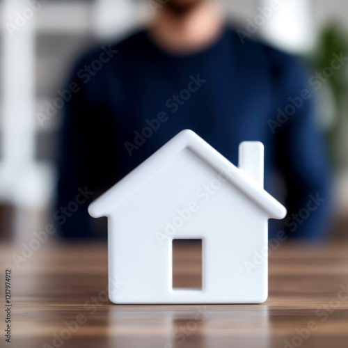 A white house figurine sits on a table, with a blurred individual in a dark shirt in the background, symbolizing homeownership or real estate.