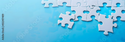 A white jigsaw puzzle on a blue background with blank space for an image. Creative banner. Copyspace image
