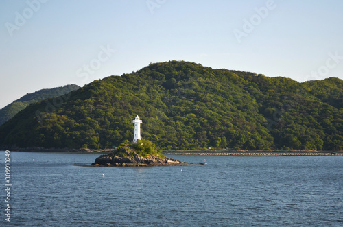 A white lighthouse is on a small rocky outcrop, with trees at its base. Small markers are around the rocks. A breakwater is in front of a tree-covered headland on the other side fo the bay. The sky is