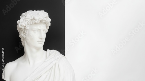 A white marble bust of a classical male figure, set against a black and white background, evokes a sense of timeless elegance and sophistication.