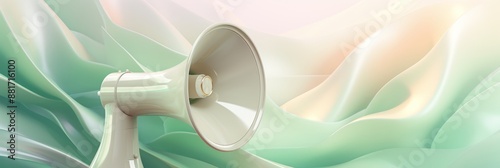 A white megaphone sits on a wavy green and white abstract background, copy space