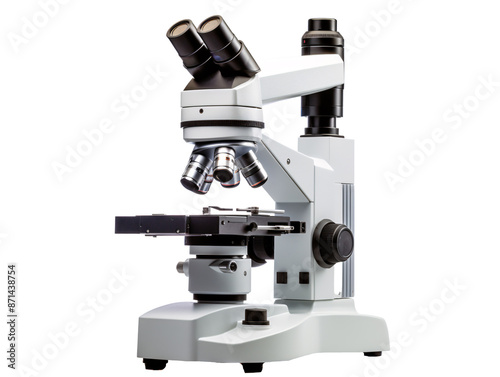 a white microscope with black lenses