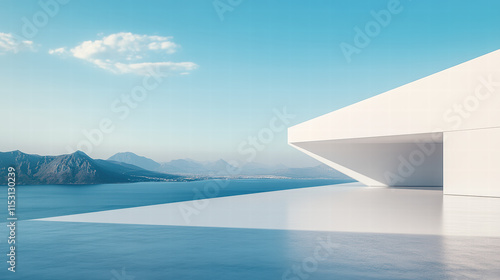 A white minimalist building with mountains in the background