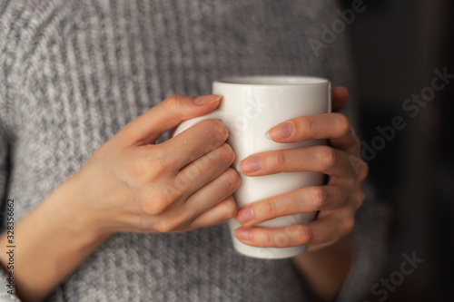 A white mug in the hands of a girl in a gray sweater. He warms his hands.