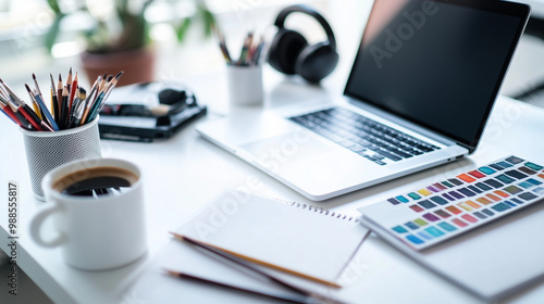 A white office desk with artistic tools, including paintbrushes, a sketchpad, colored pencils, and a coffee cup, along with a laptop and headphones.