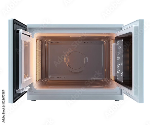 A white, open, clean built-in microwave oven with an orange light inside the door, isolated on Png Format and Transparent Background
