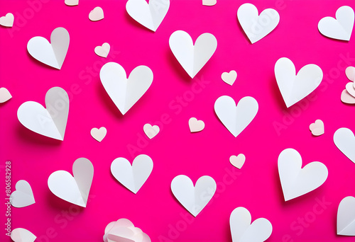A white paper heart cutout on a bright pink background