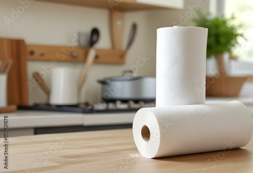 A white paper towel roll on a wooden surface in a kitchen, with blurred kitchen utensils and appliances in the background