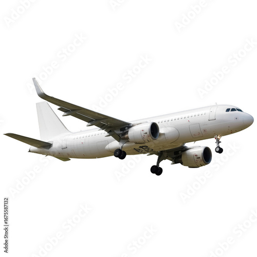 A white passenger airplane in flight isolated on transparent background, ready for landing or takeoff
