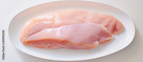 A white plate displays a raw chicken breast isolated pastel background Copy space