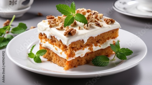 A white plate topped with a piece of carrot cake.
