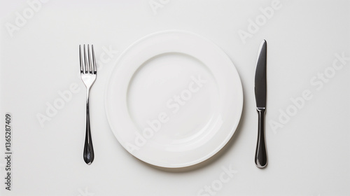 A white plate with a fork and knife on it. The plate is empty and the utensils are clean