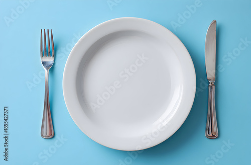 A white plate with a silver fork and knife on a blue background, ready for a meal.