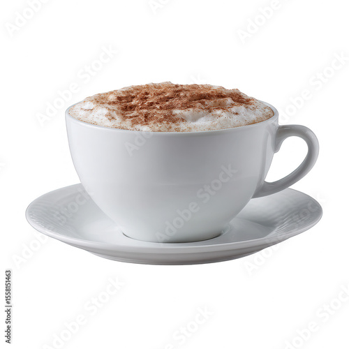 A white porcelain cup filled with cappuccino topped with creamy froth and a dusting of cocoa powder. Perfect for coffee lovers and cafe settings.