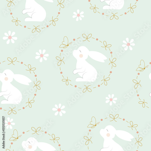 a white rabbit in bow frame with a butterfly , polka dot and flower seamless pattern , vector , illustration