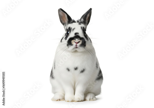 A white rabbit with black spots sitting upright on a white background looking at the camera directly