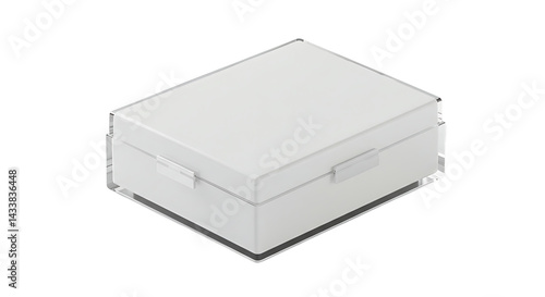 A white rectangular box with a lid sitting on a transparent surface in a studio setting