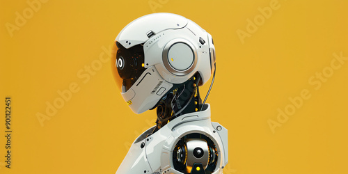 A white robot in profile view on a yellow background, representing futuristic technology and innovation.