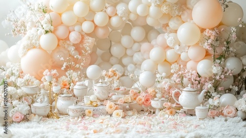 A white room with a lot of white balloons and flowers. The balloons are in different sizes and are scattered around the room. The flowers are in vases and are placed on a table