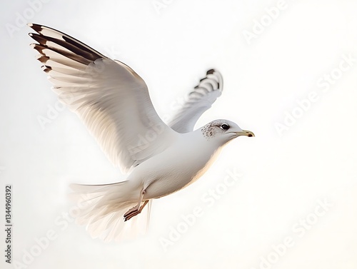 A white seagull is flying gracefully in the sky